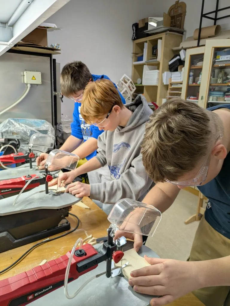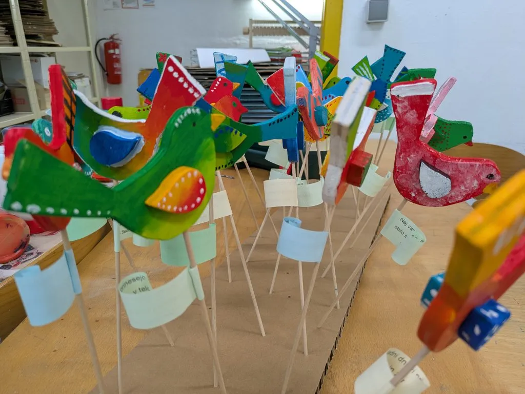 V šolski delavnici so sedmošolci v sklopu tehničnega dne najprej celotno torkovo dopoldne preživeli ob pogovoru o prostovoljstvu in izdelavi drobnih pozornosti za starejše občane Črnega Vrha. Iz lesenih plošč so izžagali ptice, jih skrbno obrusili in po lastnem navdihu živopisano poslikali. Ptice na paličici so na koncu dobile še prijazno sporočilce.